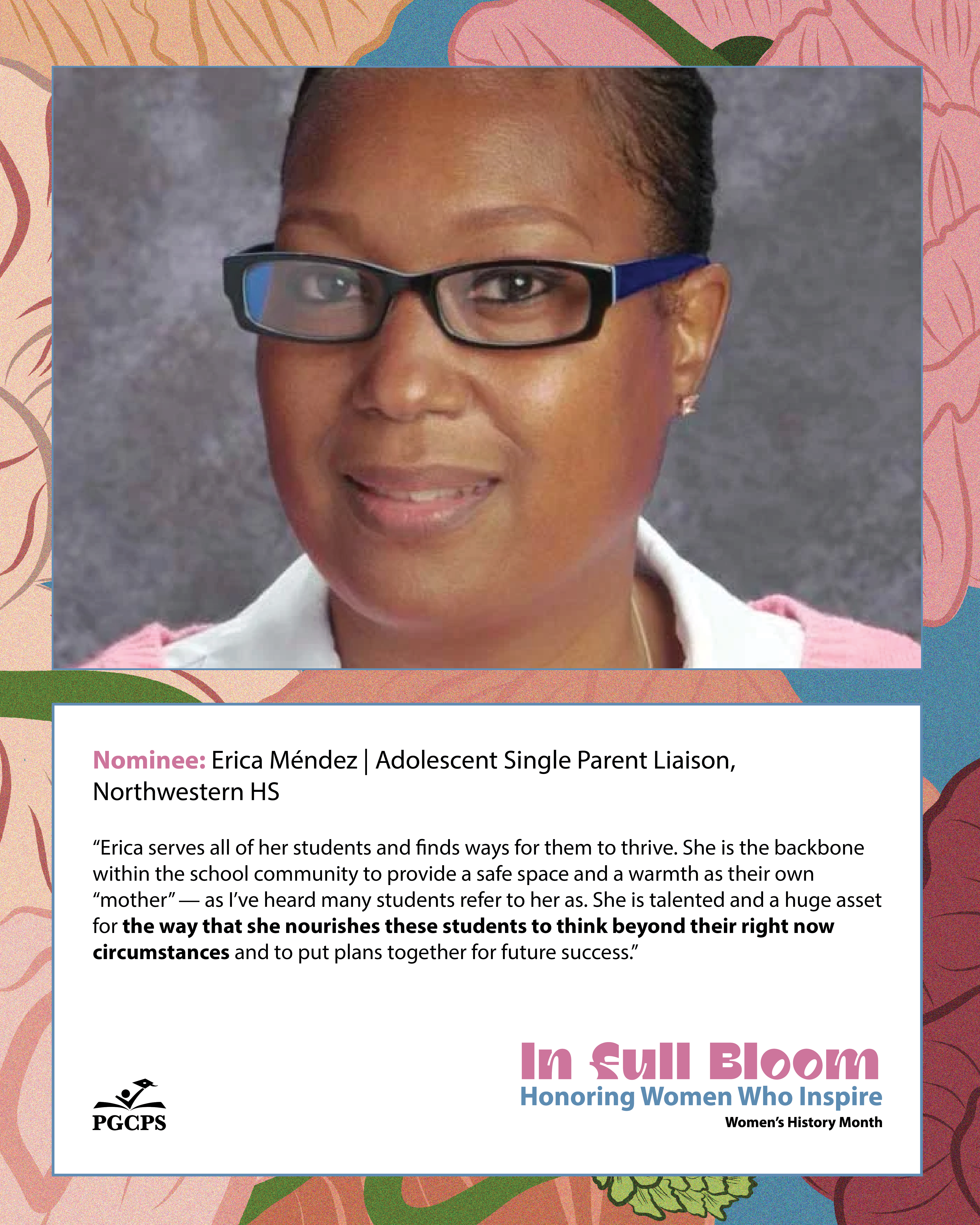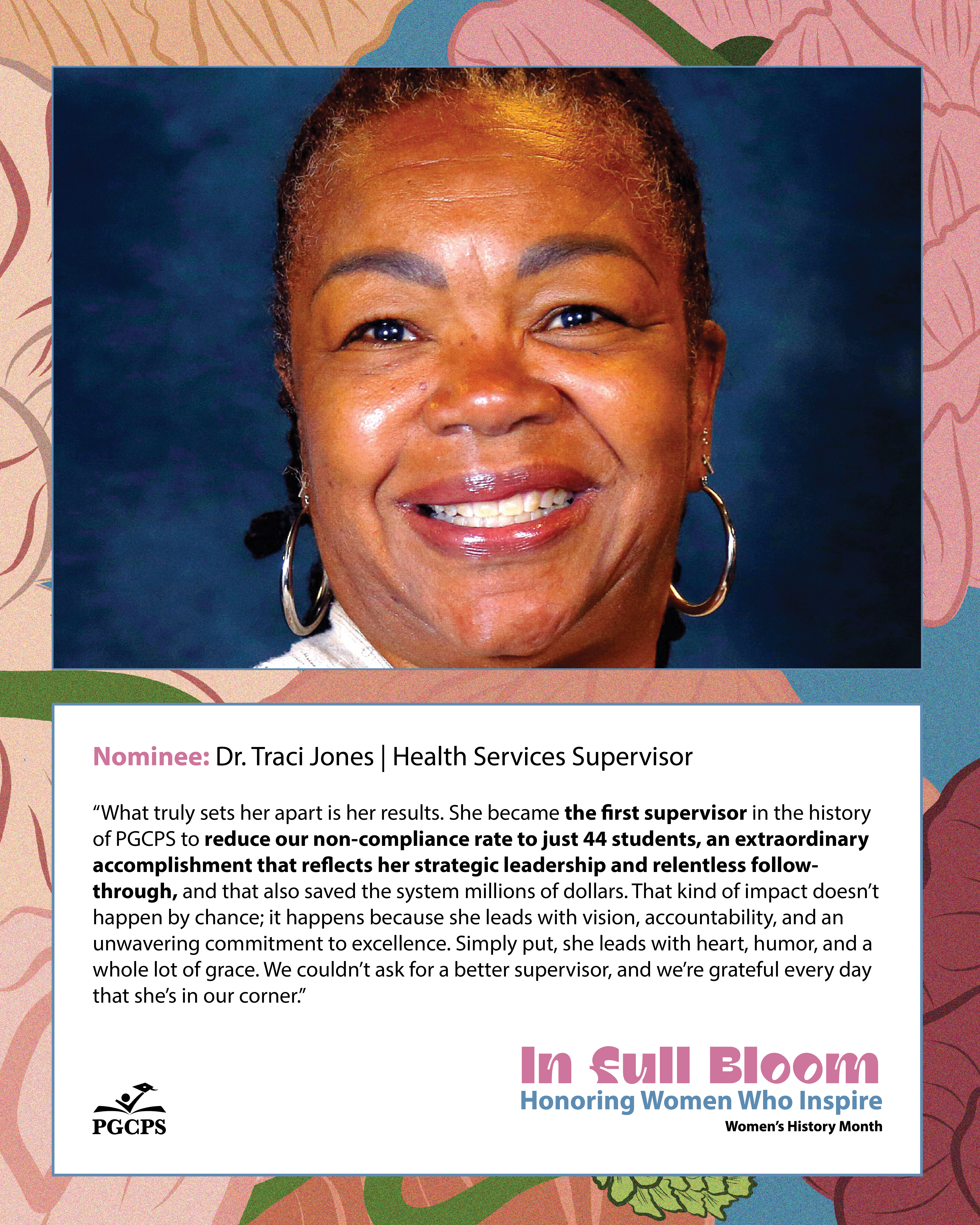 “What truly sets her apart is her results. She became the first supervisor in the history of PGCPS to reduce our non-compliance rate to just 44 students, an extraordinary accomplishment that reflects her strategic leadership and relentless follow-through, and that also saved the system millions of dollars. That kind of impact doesn’t happen by chance; it happens because she leads with vision, accountability, and an unwavering commitment to excellence. Simply put, she leads with heart, humor, and a whole lot of grace. We couldn’t ask for a better supervisor, and we’re grateful every day that she’s in our corner.”