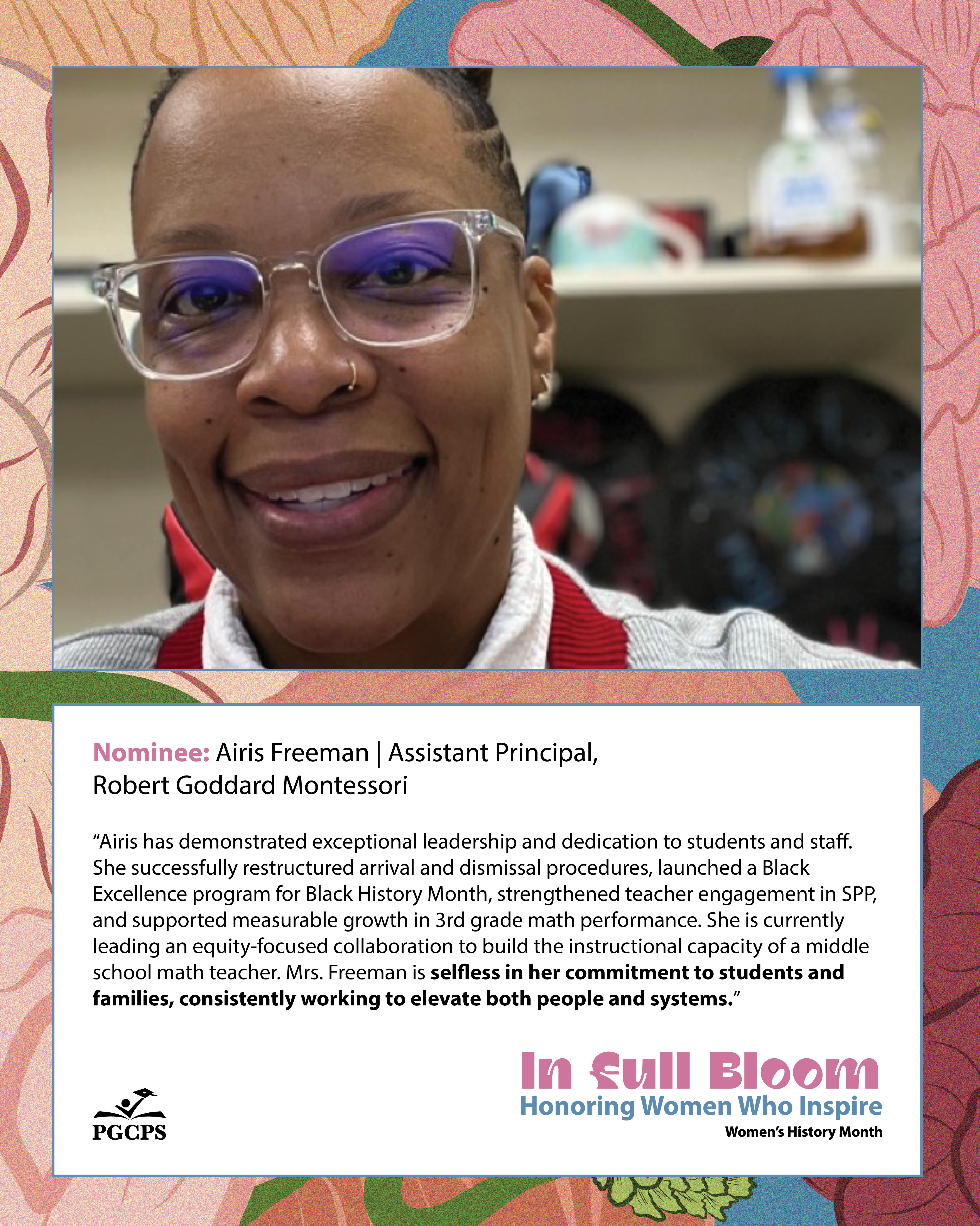 “Airis has demonstrated exceptional leadership and dedication to students and staff. She successfully restructured arrival and dismissal procedures, launched a Black Excellence program for Black History Month, strengthened teacher engagement in SPP, and supported measurable growth in 3rd grade math performance. She is currently leading an equity-focused collaboration to build the instructional capacity of a middle school math teacher. Mrs. Freeman is selfless in her commitment to students and families, consistently working to elevate both people and systems.”