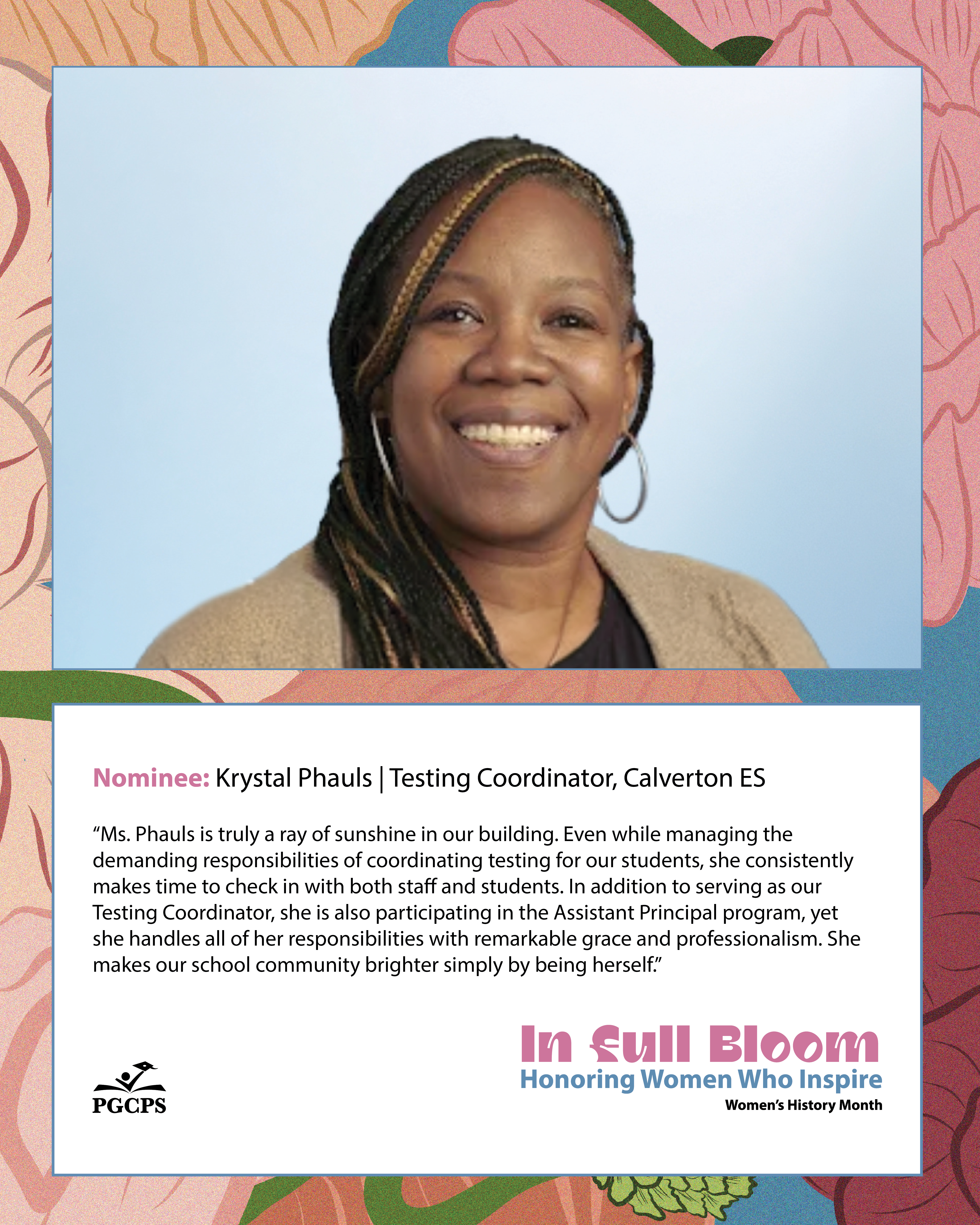 “Rashida Edwards truly deserves her flowers because she leads not just with her heart, but with a clear goal in mind: always doing what is best for our students and our staff. We have a larger population of students with autism, and managing so many moving parts is not easy. After we lost our program coordinator at the start of the year, Ms. Edwards took on two roles not only as principal, but also as autism program coordinator. She does it all with grace, resilience, and a calm presence that reassures everyone around her.”