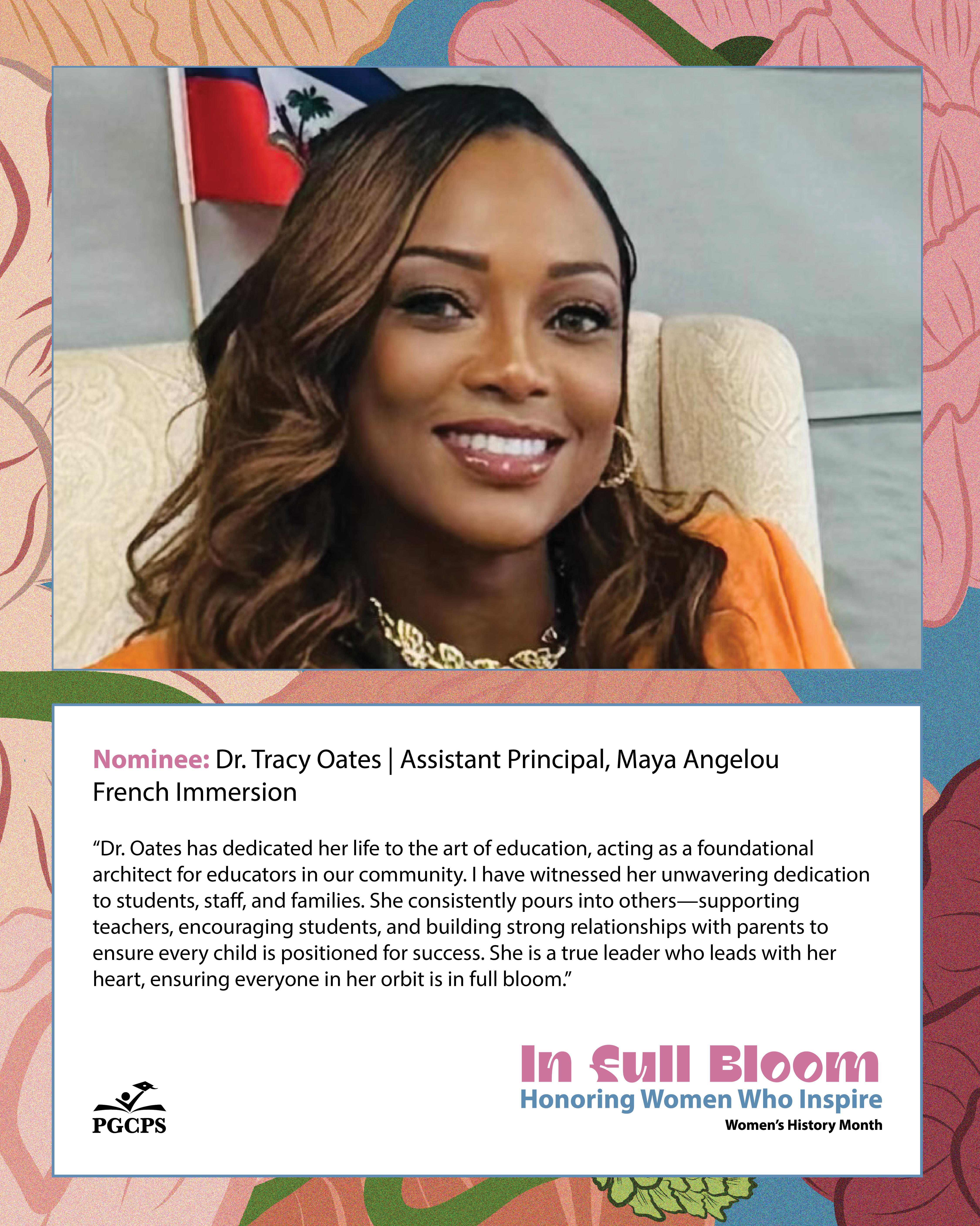 “Dr. Oates has dedicated her life to the art of education, acting as a foundational architect for educators in our community. I have witnessed her unwavering dedication to students, staff, and families. She consistently pours into others—supporting teachers, encouraging students, and building strong relationships with parents to ensure every child is positioned for success. She is a true leader who leads with her heart, ensuring everyone in her orbit is in full bloom.”